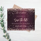 A modern and elegant Save the Date for a 50th birthday party. A deep burgundy gradient background. Decorated with rose gold confetti. Personalize and add date, place, name and age. Rose gold coloured text.