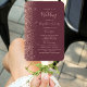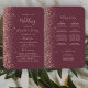 This elegant, modern wedding program fan features a dark burgundy background edged with rose gold faux glitter. The text appears in elegant rose pink handwriting and copperplate fonts.