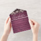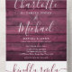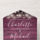 All in one wedding invitation with pretty string lights, signature style names and chic typography on a burgundy rustic wood background. The invitation includes a perforated RSVP card featuring a QR code. Designed by Thisisnotme©