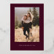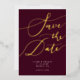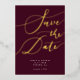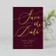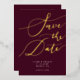 Elegant save the date card featuring hand lettered calligraphy text that says "save the date" in gold on a burgundy red background. You can add a photo on the back.