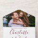 All in one wedding invitation featuring your special photo and elegant burgundy signature script name and monogram initials on a burgundy background. The invitation includes a perforated RSVP card that’s can be individually addressed or left blank for you to handwrite your guest's address details. Designed by Thisisnotme©