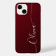 Burgundy Red Shimmer White Elegant Calligraphy Script Custom Personalized Name iPhone 14 Smart Phone Cases features a modern and trendy simple and stylish design with your personalized name in elegant hand written calligraphy script typography on a metallic burgundy red shimmer background. Designed by ©Evco Studio www.zazzle.com/store/evcostudio