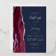 The left-hand edge of this elegant modern wedding invitation features a burgundy red watercolor agate border trimmed with faux silver glitter. The customizable text combines handwriting, copperplate and italic fonts in real silver foil on a navy blue background. The reverse side features a matching burgundy and silver agate design.