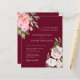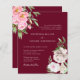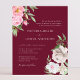 An elegant budget floral wedding invitation featuring pink watercolor flowers with modern handwritten calligraphy on a burgundy red background.