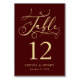 This table number card features whimsical flourish gold typography on a burgundy background. You can add your details in the customize menu. This menu is part of a beautiful matching wedding suite that can be fully personalized.