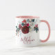 Burgundy watercolor botanical peony rose floral girly personalized name and monogrammed mug. Burgundy, vine red and white watercolor rose botanical floral design with dark green foliage, pine branches and berries on white background. Feature an elegant handwritten typography script you can change with your name and monogram initial. Great girly monogrammed gift in fall and winter season. #3334