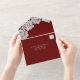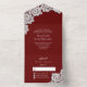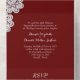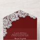 Chic burgundy coloured tri-fold wedding invitation, with lovely graphics of white lace. The custom text is ready to personalize for your wedding day.