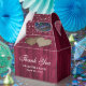 Rustic burgundy wedding thank you favour box featuring string lights on a barn wood background.