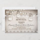 Elegant rustic burlap and white lace design rehearsal dinner invitation with string of lights and hanging mason jars.
