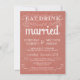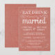 Eat, Drink, and be Married -- Vintage style rustic country wedding invitations -- Swirly, curly scrolls and old-fashion typography on coral peach pink burlap background. Add your names and wedding info in this easy to use template. Elegant but fun and whimsical, chalkboard style script writing can be modified for your formal or semi-formal retro wedding theme. Casual modern style is perfect for trendy contemporary weddings with a fun touch of sophisticated charm for the traditional bride and groom. Please contact us for help with customization if you need additional room for your wedding details. Other sizes and chalkboard styles available.