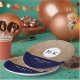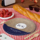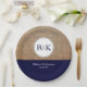 This simple and modern wedding paper plate offers a white circle with the monogram of the bride and groom on a photo of burlap as the background. Customizable text on a dark navy blue background near the bottom, features the names of the bride and groom and their wedding date.