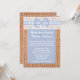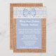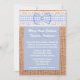 Sweet country charming wedding invitations, done in a burlap look, with a pale blue text area, on front. Graphics of white lace and a light blue and white gingham ribbon and bow stretch across the top. Personalize the white text for your special day. Matching wedding products available.