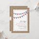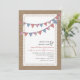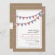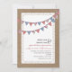 A casual wedding invitation featuring an illustration of bunting that is red gingham, pink floral, and blue over a lace inspired design on front. Background on front and back is burlap inspired. Personalize the text with details of your occasion.