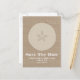 A postcard featuring a background photo of burlap. Image of sand dollar at centre. Personalize the text with details of your occasion. Look for matching invitations at Jill's Paperie.
