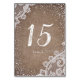 Elegant white vintage lace and sparkle silver glitter on rustic burlap background. great wedding table cards for rustic wedding, barn wedding and country wedding.