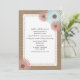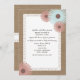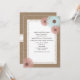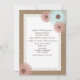A wedding invitation featuring a burlap inspired background with white lace inspired design on front and back. Personalize the text on front with details of your occasion. Personalize the back with names of bride and groom. Front features peach and light blue flowers.
