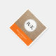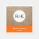 This simple and modern wedding napkin features a white circle with the monogram of the bride and groom on a photo of burlap background. Customizable text, on an orange background near the bottom, features the names of the bride and groom and their wedding date.