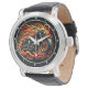 This watch face features a dynamic illustration of a custom motorcycle, engulfed in vivid orange, red, and yellow flames. The bike is rendered with intricate detail, set against a dark background, emphasizing motion and power. Silver numbers and watch hands maintain functionality, creating a bold and energetic accessory for motorcycle enthusiasts who appreciate dramatic art.