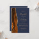 The left-hand edge of this elegant modern wedding invitation features a burnt orange watercolor agate border trimmed with faux gold glitter. The customizable text combines gold-coloured handwriting, copperplate and italic fonts on a dark navy blue background. The reverse side provides space for wedding details on a solid navy blue background, along with a QR code guests can scan to visit your website and RSVP, which saves the cost of printing and mailing separate RSVP cards.