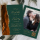 The left-hand edge of this elegant modern wedding invitation features a burnt orange watercolor agate border trimmed with faux gold glitter. The customizable text combines gold-coloured handwriting, copperplate and italic fonts on a dark green background. Add your favourite photo to the reverse side, along with additional text and a QR code to send guests to your wedding website.