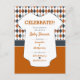 Oversized elegant argyle pattern in school colours of burnt orange and grey set the backdrop for this cute baby shower design. A white baby bodysuit has all the text written on it for the big event, which can be a couples shower or just for mom. Design comes in maroon and grey, burnt orange and grey, red and black, green and black, orange and navy, green and yellow, and purple and grey. Matching products available.