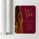 This elegant modern save the date magnet features a burnt orange watercolor agate border trimmed with faux gold glitter. Easily customize the gold-coloured text on a burgundy background.