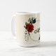 Unique coffee mug featuring romantic burnt orange and navy blue flowers and green leaves.