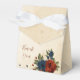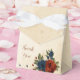 Unique wedding favour box featuring romantic burnt orange and navy blue flowers and green leaves.