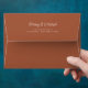 Modern return address envelope in burnt orange, with your name(s) in a handwritten script font, and the address in a plain san serif font. The fonts on both lines can be change to suit your style.