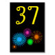 This table card design features a customizable number above a bursting fireworks-like pattern of various colors.