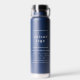 Insulated water bottle that you can customize to put your business name. You can give it as gift, giveaway item or promotional product to promote your brand name to your customers or clients. You can also include it in your marketing materials to advertise your business. Customizable water bottle that you can use to build brand name awareness. Label design on the bottle is white texts on navy blue background. To customize this water bottle, upload your business logo, type your business or company name, address, phone number, e-mail and website or social media page. After uploading logo and typing texts, please check the appearance on front and back sides. If the appearance is pleasing to you, you can place your order now. If you need to resize and move the logo and texts to fit on this bottle or on other sizes and styles that you will choose, please change in the design tool. You can also make other changes according to the appearance that you prefer in the design tool such as changing the background colour, font colour and font style.
