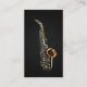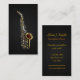Illustrated business cards for saxophone players or instructors; black and golden music design with illustration of saxophone outline; design is personalized with customizable text fields for adding your name, business, address and other informations