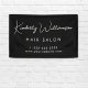 Chic promotional black banner sign for your business with a minimalist vibe featuring your company name or brand in a stylish white signature script and additional text below in simple modern white lettering.
