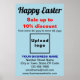 Customizable poster with Easter holiday Sale, your business name and other information. Poster that you can use as marketing material to attract more customers. Customize and use it to convince more customers to buy your products or clients to like your services this Easter holiday. Design colours and shape are black, dark blue and red texts on light blue background and portrait format rectangle shape. Contents are Happy Easter texts, sale texts, percent discount that you will offer, sale dates, your business name, logo, address, phone number, e-mail and website or your social media page. Please check the appearance after uploading logo and typing texts. If the appearance is pleasing to you, you can place your order now. If you need to resize and move the logo and texts to fit on this poster or on other appropriate size, shape and style that you will choose, please change in the design tool. You can also make other changes in the design tool according to the appearance of this poster that you prefer such as changing the background colour, font colour and font style. Happy Easter! Wishing you more sales this holiday.