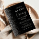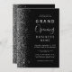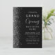 Invite customers to the grand opening of your business with this elegant modern invitation, featuring a silver faux glitter border on a black background. The customizable text combines silver grey handwriting, copperplate and italic fonts. The reverse side features a matching black and silver glitter design.