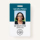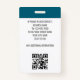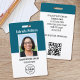 Create a professional appearance with a branded employee ID badge. This editable template can be personalized with your profile photo, name, job title, and company logo. Return details are on the back, along with additional information, and a QR code. Perfect for creating a cohesive branding experience, or simply to verify the identity of the wearer and display their qualifications. This identification badge is ideal for customer-facing roles and corporate settings — from business consultants and retail stores to medical professionals, hospital staff, office workers, conference teams, corporate events and more. Custom badges build brand identity and enhance security. Printed colours: blue-green teal, grey and white. Vertical format.
