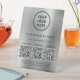 Modern and professional brushed silver faux metallic table top pedestal sign for your business. Upload your logo and 3 QR codes for customers to scan for payment, information, a list of your products, services, prices, etc. Label your QR codes and add your business name, phone number, street address, website or other information in simple typography.