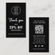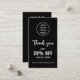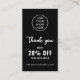 A vertical minimalist custom business logo black and white QR code discount card for a professional business to use as a promotional tool to develop customer loyalty. Replace the image with a square photo of your logo. You can change the font, font colour, font size, letter spacing, background colour, colour of the Thank you graphic and reposition the text using the Design Tool. You can also change the social media icons so they are relevant to your business. The simple modern elegant design is yours to customize as you wish.