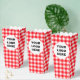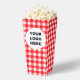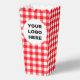 This classic red gingham popcorn box is a perfect choice for your next event. Its charming chequered pattern and scalloped top evoke a fun, retro picnic feel that's ideal for parties, movie nights, and celebrations. The large customizable space on the front allows you to add your personal message, business logo, or unique photo design, making it a memorable party favour or professional branded snack box. It’s a stylish and practical way to serve popcorn or other treats to your guests.