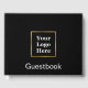 Would you like to record who attends your corporate events? A guest book makes recordkeeping easy and personal. On the front of this black and faux (not foil) gold guest book, there's a large display image at the top on a black background. (Shown: Your Logo Here). You can replace the display image with your business logo. The faux gold border is not made of foil. Display text is under the logo. You can edit the text (shown: Guestbook) if desired.