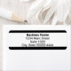 These business return address labels are black and white. There are four lines of black display text for your business name and return address. All text can be edited or deleted. Black horizontal lines are at the top and bottom of the label.
