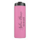 The top line of the display text is an elegant black script. You can replace the display text with a custom message such as your beauty salon's name and phone number. The thermal tumbler is pink. The text is black.
