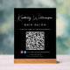 Chic black acrylic sign featuring your name in a stylish white signature script and business in modern white typography. Input your website address to create a scannable QR code for customers and clients to see your products, services, hours, etc. Add your instagram and facebook user ids for customers to follow you on social media.