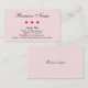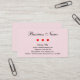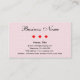 Description: This is a business card full of hearts. The background of both sides is a semi-transparent image of small hearts. On the front is all of the information except for the business slogan which is on the back. Three red hearts divide the business name from the rest of the information on the front.