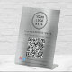 Modern brushed silver faux metallic table top pedestal sign for your business featuring your QR code for customers to scan for a list of your products, services and prices, your logo and your business name, phone number and street address in simple typography. Add your instagram and facebook user ids for customers to follow you on social media.