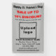 Happy Saint Patrick’s Day! Another holiday to celebrate this March and to advertise also your business or to promote your brand name. Green is always the colour for this holiday but try also other colours. Customizable grey banner with Saint Patrick Sale, your business name and other information. This might be the colour that matches your business colour scheme. Banner that you can use as marketing material to attract more customers. Customize it and display it to convince more customers to buy your products or clients to like your services. Contents are Happy Saint Patrick’s Day greeting, sale texts with percent discount that you will offer, sale dates, your business name, logo, address, phone number, e-mail and website or your business social media page. Please check the appearance after uploading logo and typing texts. If the appearance is pleasing to you, you can place your order now. If you need to resize and move the logo and texts to fit on this banner or on the size that you will choose, please change in the design tool. You can also change the background colour, font colour and font style in the design tool. Wishing you the best of luck, joy and more sales this holiday.