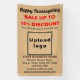 Happy Thanksgiving! Holiday to celebrate this November to thank for the blessings that we received. It is also one of the holidays to advertise your business. Customizable banner with Thanksgiving Sale, your business name and other information. Banner that you can use as marketing material to attract more customers. Customize it and display it to convince more customers to buy your products or clients to like your services. Design colours are black, dark brown and red texts on light brown background. Contents are Happy Thanksgiving greeting, sale texts with percent discount that you will offer, sale dates, your business name, logo, address, phone number, e-mail and website or your business social media page. Please check the appearance after uploading logo and typing texts. If the appearance is pleasing to you, you can place your order now. If you need to resize and move the logo and texts to fit on this banner or on the size that you will choose, please change in the design tool. You can also change the background colour, font colour and font style in the design tool. Happy Thanksgiving! Wishing you more sales this holiday.