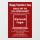 Happy Valentine’s Day! A lovely holiday to celebrate this February and to advertise also your business products and to promote your brand name. Customizable red colour window cling with Valentine Sale, your business name and other information. Window cling that you can use as marketing material to attract more customers. Customize it and display it to convince more customers to buy your products or clients to like your services. Contents are Happy Valentine’s Day greeting, sale texts with percent discount that you will offer, sale dates, your business name, logo, address, phone number, e-mail and website or your business social media page. Please check the appearance after uploading logo and typing texts. If the appearance is pleasing to you, you can place your order now. If you need to resize and move the logo and texts to fit on this window cling or on the size and shape that you will choose, please change in the design tool. You can also change the background colour, font colour and font style in the design tool. Happy Valentine’s Day! Wishing you more sales this holiday.
