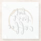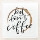 "But First Coffee" written in black calligraphy with a circular coffee stain on a glass coaster.