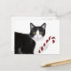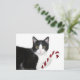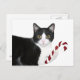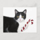 Black and white kitty cat holds a Christmas striped candy cane in astonishment because he really wanted catnip photo Christmas postcard